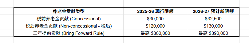 注:利用“三年提前供款”计划需满足个人养老金总余额(Total Super Balance)小于特定值(预计调升至 $186 万)。