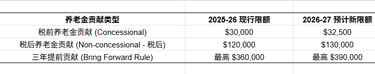 虽然最终的 AWOTE 数据将于下月确认,但业内专家普遍预测,个人养老金贡献上限也将同步上调,为您提供更大的节税(Tax Deduction)空间: